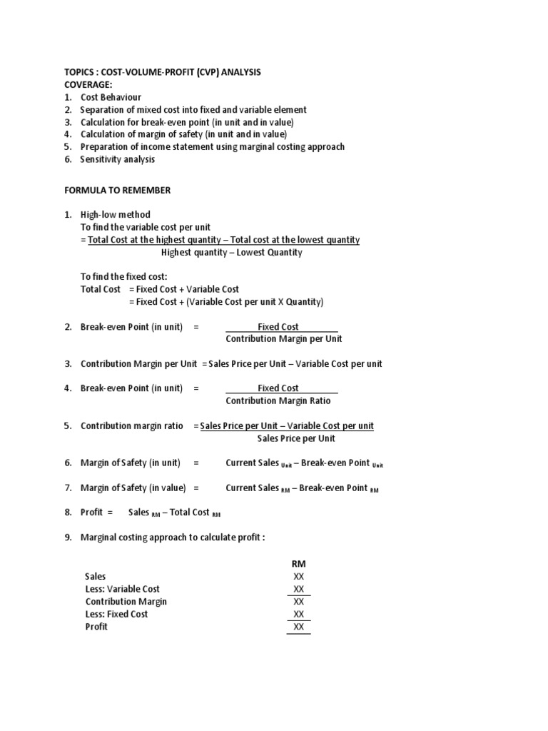 This paper seeks to discuss the in conclusion, there are five main features of cvp analysis; Key calculations when using cvp analysis are the contribution margin and the contribution margin ratio. Managers use the contribution margin to plan for the business. Cost volume profit analysis thinks like a number line wherein it starts with negatives, then comes 0 and then positives. The purpose of this analysis is to test the credibility of the data from th e.